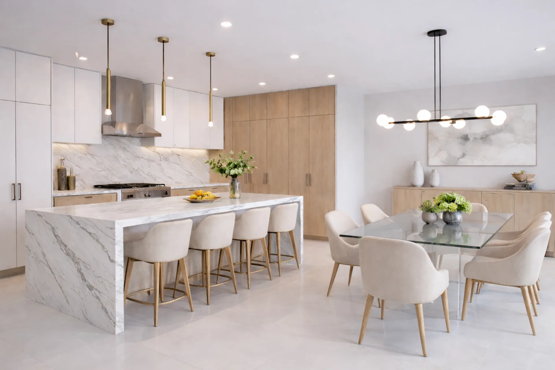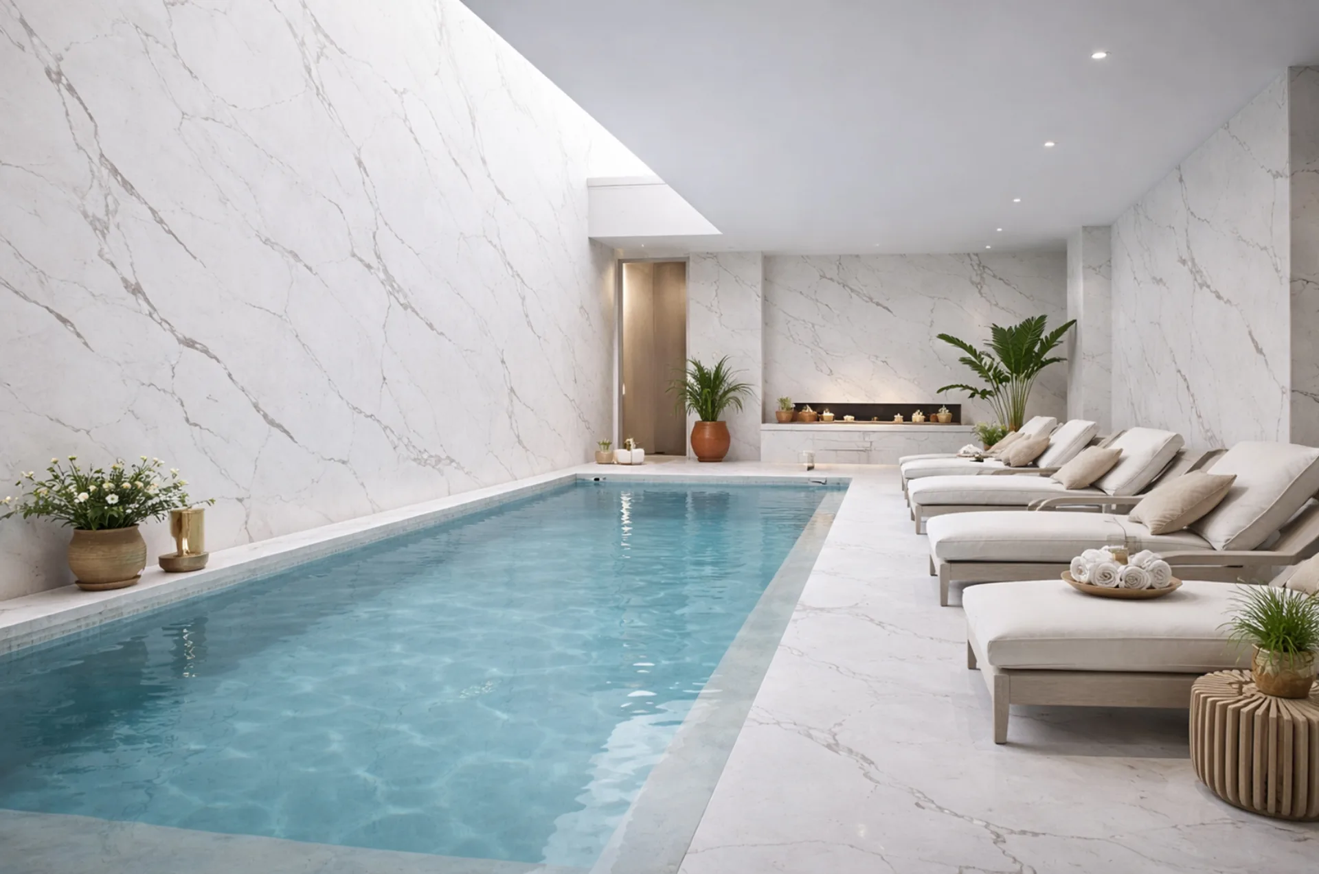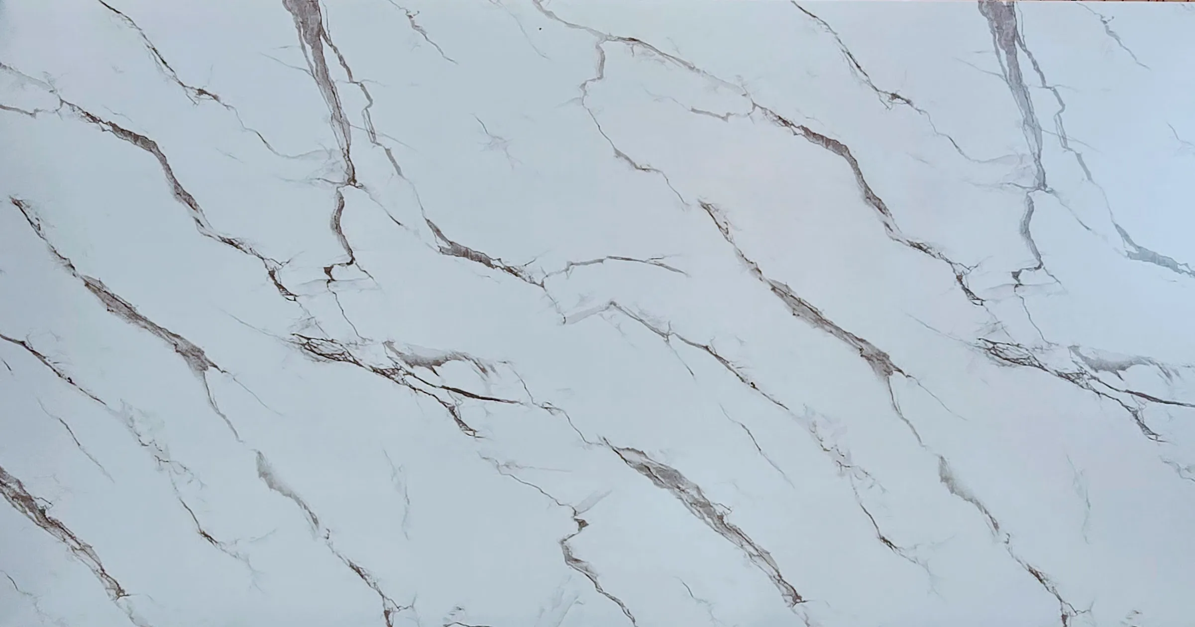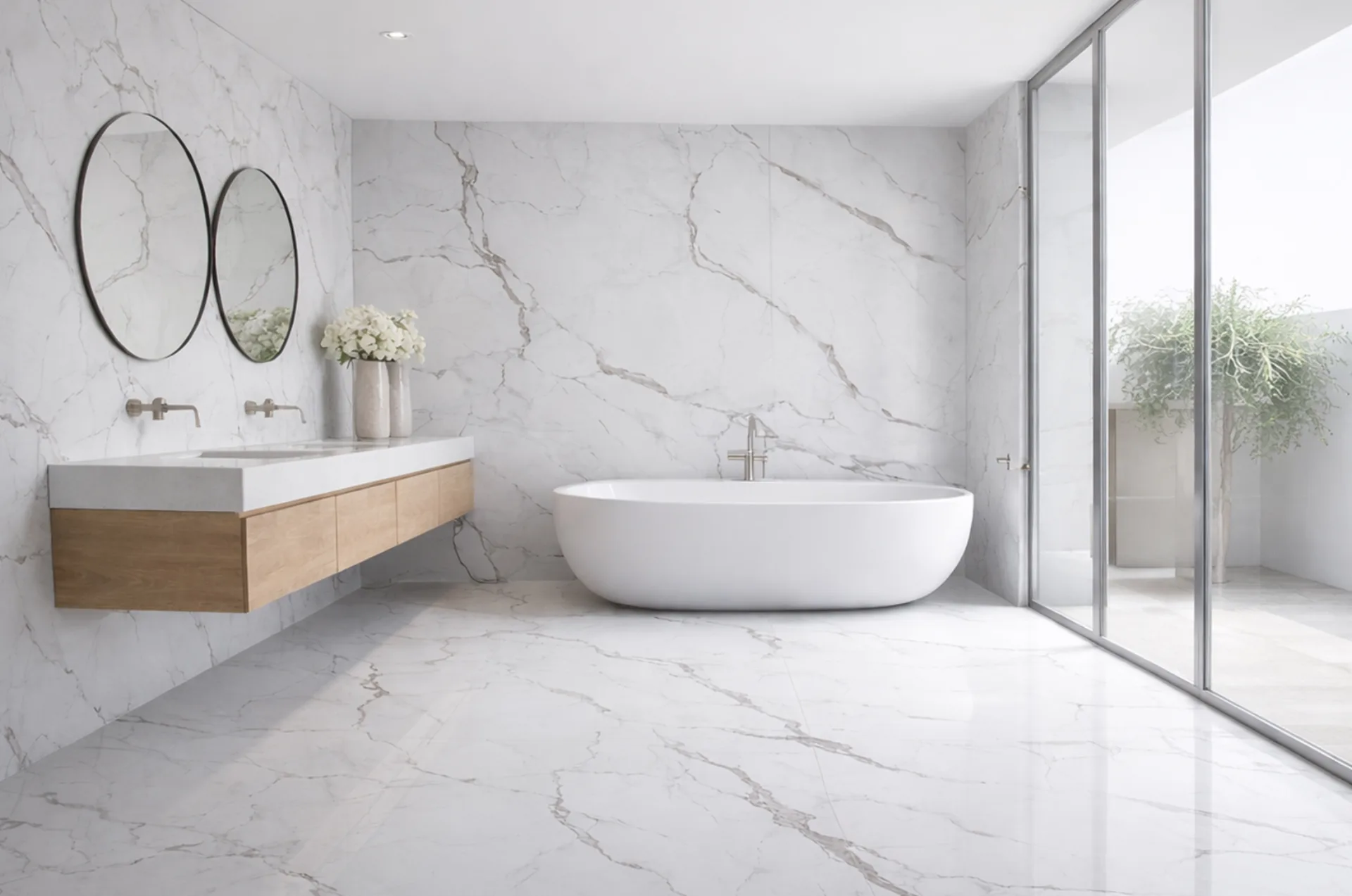 Apariencia tipo mármol blanco con vetas grises sutiles. La elegancia atemporal del Carrara italiano.